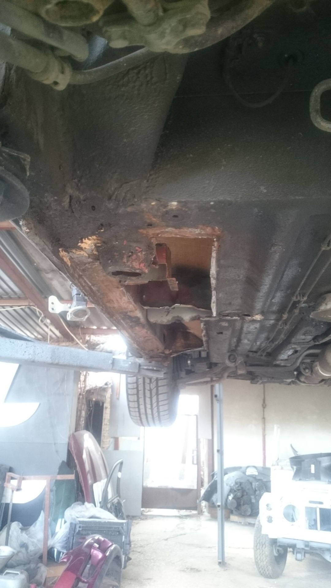 Itt a munka közepét sikerült megörökítenem... Gyakorlatilag a fenéklemez a kipufogótól a küszöbig ki lett vágva, le lett cserélve. A hátsó sárvédőívek cserélve lettek immár akkor másodjára és a doblemezbe is bele lett javítva. Az volt a lényeg az újabb nekifutásnál tapasztaltabb fejjel, hogy ne tudjon sehonnan átkúszni a rozsda az egyik lemezről a másikra. Szeretném ha 30 éves koráig kitartana, amíg én vagyok a gazdája.